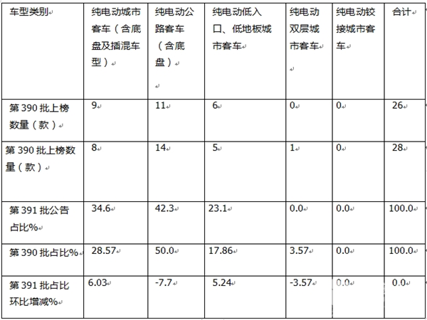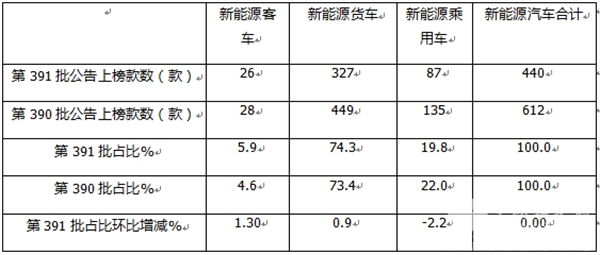 表1,根据工信部数据,第391批新能源汽车公告中各大类车型上榜数量及占比、占比环比增减: