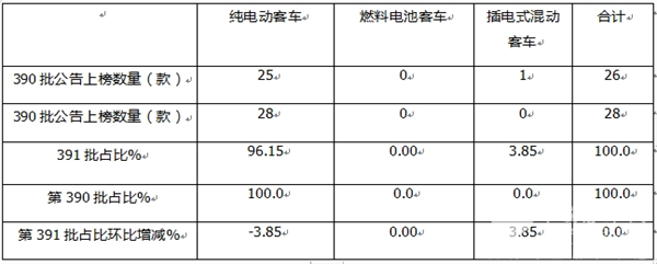 按汽车大类划分,第391批公告中上榜的新能源车型中,包括新能源客车26款,占比5.9%,占比环比增加1.3个百分点。