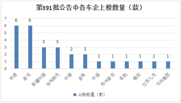 在第391批公告中共有12个客车品牌企业参与了新能源客车新品申报,各个品牌上榜数量统计如下: