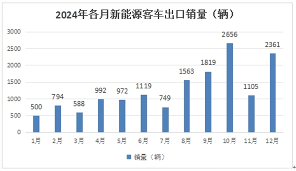 根据中国客车统计信息网数据,2024年1-12月各月我国新能源客车出口数量统计: