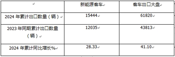 上表显示,在2024年全年我国新能源客车累计出口销量、同比及市场占比: