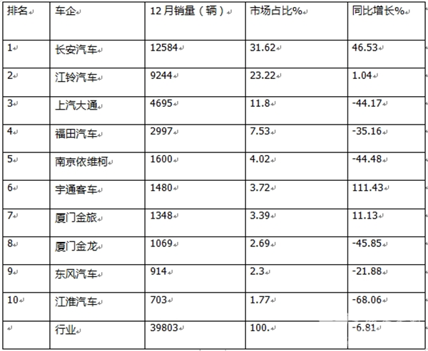 值得一提的是,作为大中 型客车“巨无霸”的宇通,第一次跃升到轻客行业第六名,表现抢眼。