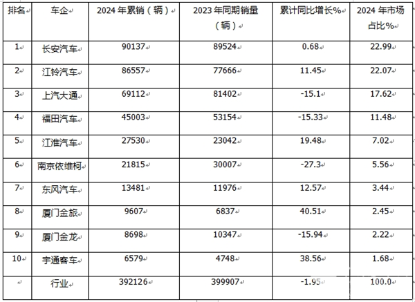2024年全年轻客累销39.2万辆,同比下降1.95%,长安\江铃\大通居前三;金旅\宇通领涨。