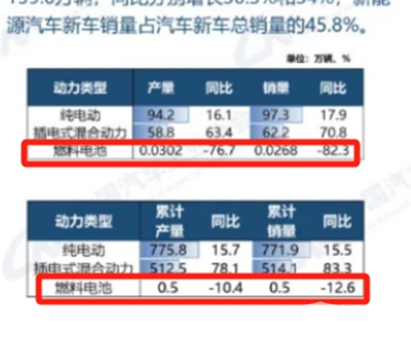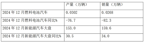 上表可见,2024年12月燃料电池汽车产销分别为302辆和268辆,同比分别下降76.7%和82.3%,产量同比均跑输2024年12月新能源汽车产销大盘。