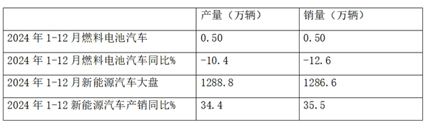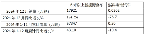 表1,根据中汽协数据,2024年12月燃料电池汽车产量同比统计: