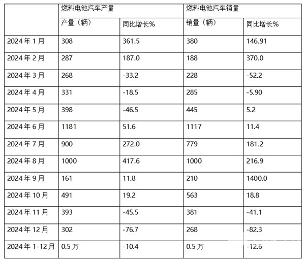 表2,根据中汽协数据,2024年燃料电池汽车产销同比统计: