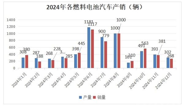从上图表可见,在2024年1-12月的各月燃料电池汽车产销量中,2024年12月产量为302辆,居2024年各月第九,处于下等水平;2024年12月燃料电池汽车的销量为268辆,居2024年1-12月各月销量第九。可见2024年12月燃料电池汽车产销量均居2024年1-12月各月下等水平,说明2024年12月燃料电池汽车市场在2024年以来各月中表现较差。