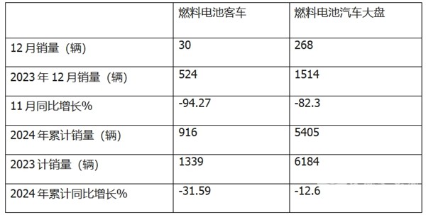 根据终端上牌数据,2024年12月我国燃料电池客车销售30辆,同比2023年12月的524辆下降94.27%;跑输2024年12月燃料电池汽车销量同比76.7%的降幅;