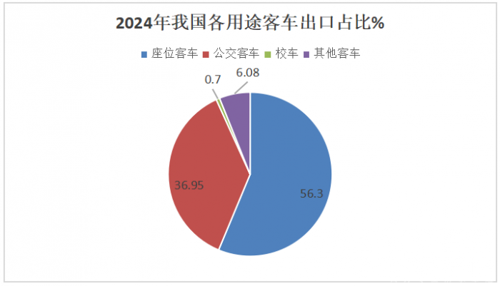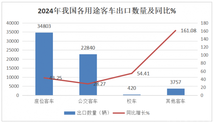 可见座位客车(主要是大中型)与公交客车是2024年我国客车出口最多的两个主要细分市场。