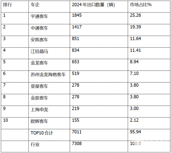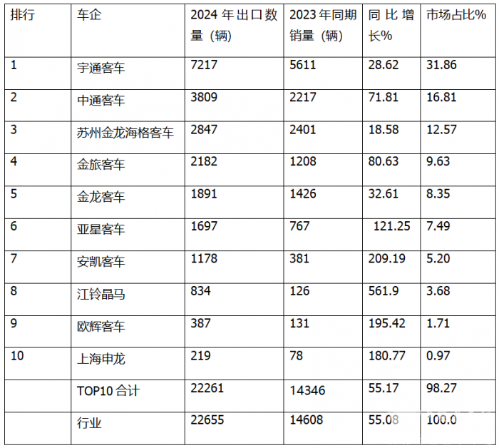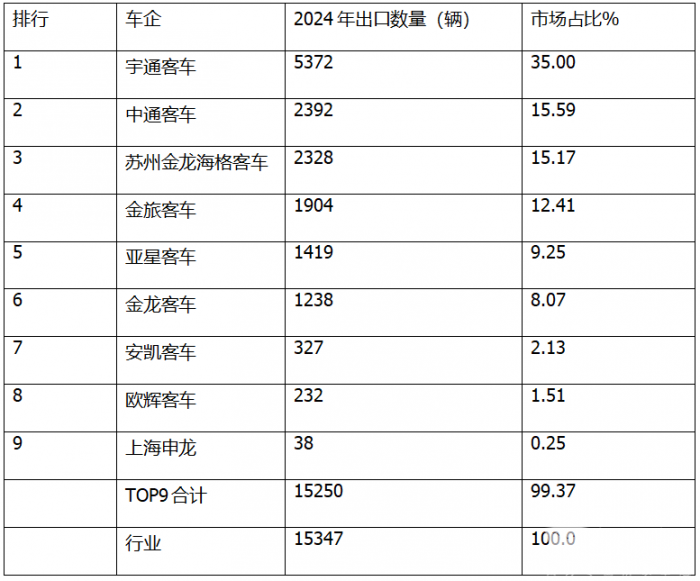 2024年大中型座位客车及公交客车出口排行出炉