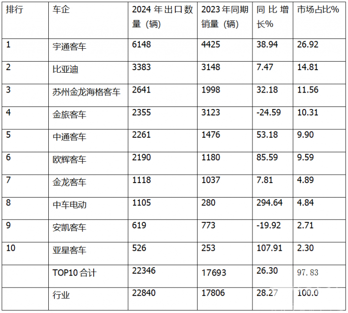 根据中国客车统计信息网统计数据,2024年我国公交客车累计出口22840辆,累计同比增长28.27%,前排名前10的企业排行如下表: