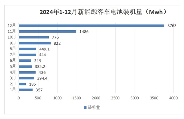 根据截图1可知,2024年12月的新能源客车动力电池装机量为3763辆,结合中国汽车流通协会提供的2024年各月新能源客车动力电池装机量数据,可知2024年12月的电池装机量创下2024年各月新高。