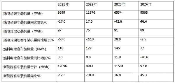 ----2024年1-12月插电式混动客车动力电池装机量居近4年第三,表现较差