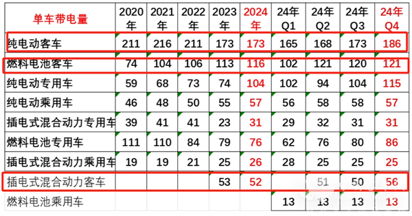 ----2024年1-12月纯电动客车单车平均带电量为:将截图3中2024年4个季度的单车平均带电量相加再除以4即得:(165+168+173+186)/4=172.9KWh,在近4年中居于最低;说明近年来市场对纯电动客车需求车型“大转小”趋势明显。