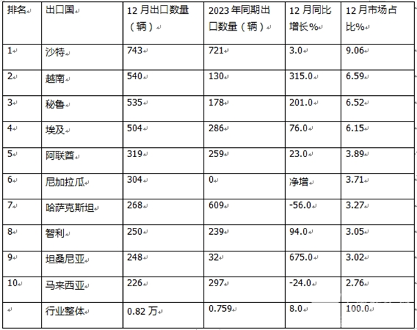 表1,根据中国汽车流通协会提供的海关数据,2024年12月我国客车TOP10出口国排行: