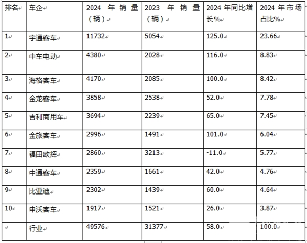 2024年新能源客车终端市场:销49576辆!增6成,宇通\中车\海格居前三