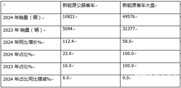 根据终端上牌数据,2024年我国新能源公路客车累计销售10821辆(将1-12月各月销量相加所得),累计同比2023年的5094辆112.4%,跑赢2024年新能源客车终端市场大盘58%的增速近54.4个百分点,成为2024年国内新能源客车最大的增量市场。