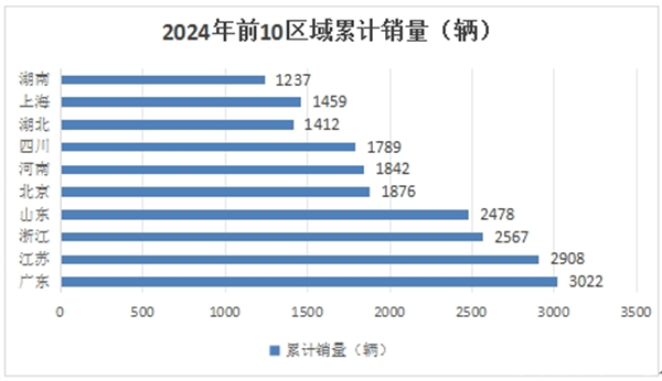 根据终端上牌数据,2024年国内新能源客车累计销售49576两,全国前10区域市场销量统计如下: