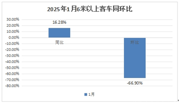 根据中国客车统计信息网数据,2025年1月6米以上客车销量7877辆,同比增长16.28%,环比下降66.9%。可见从同比看,收获了“开门红”;但从环比看,“开门红”含金量显得不足,不过切实是“情有可原”。