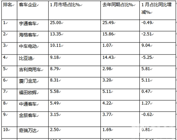 总之,今年1月6米以上新能源客车前10车企市场占比同比6增4降,其中中车电动占比同比增加最多。