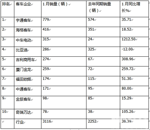 2025年1月6米以上新能源客车:销3116辆 增38.39% 宇通\海格\中车前三