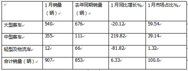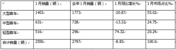 由于比亚迪产销快报未将客车销量按大中轻车型进行具体分类,因此未知其在今年1月大中轻客车各细分市场具体销量及同比增长情况。