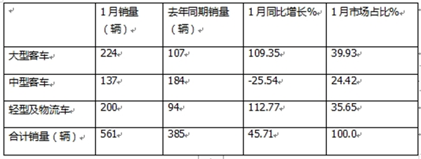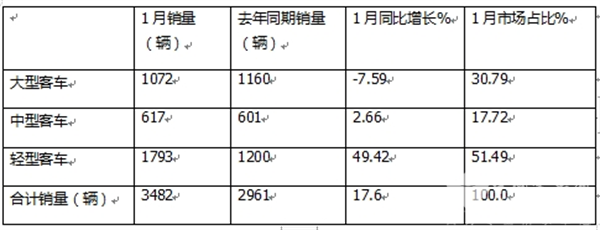 金龙轻客同比大涨,显示出轻型客车市场的良好发展态势。据分析主要是今年1月金龙汽车在海外出口市场方面,轻客市场表现较好。因此拉升了其轻客整体市场的销量及同比增速。