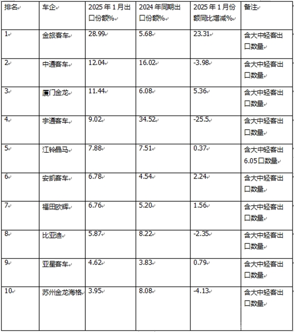 表1,根据中国客车统计信息网数据,2025年1月客车出口TOP10排行: