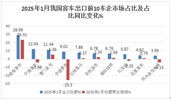 上图表显示,在2025年1月客车前10企业累计出口市场占比同比增减中: