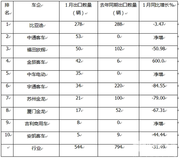 1月新能源客车出口:销544辆降31.49% 比亚迪强势领跑,中通\欧辉分列二三