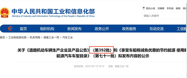 2025年2月19日,工信部发布关于《道路机动车辆生产企业及产品公告》(第392批公告,下也称“本批次公告”),这是2025年以来工信部发布的第2个批次的汽车新车产品公告。
