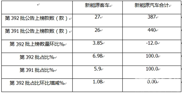 表1,根据工信部数据,第392批新能源汽车公告中各大类车型上榜数量及环比增长、占比及占比环比增减: