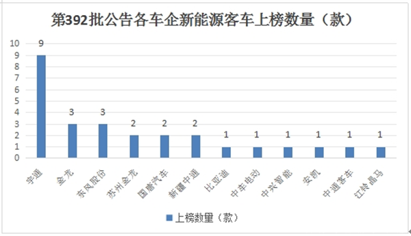 在第392批公告中共有12个客车品牌企业参与了新能源客车新品申报,各个品牌上榜数量统计如下: