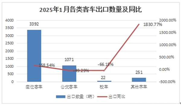 ----2025年1月其他类客车(主要是各类专用类客车)出口251辆,同比暴增1830.77%而领涨各细分市场,市场占比5.3%,居第三