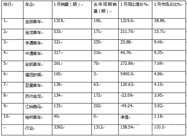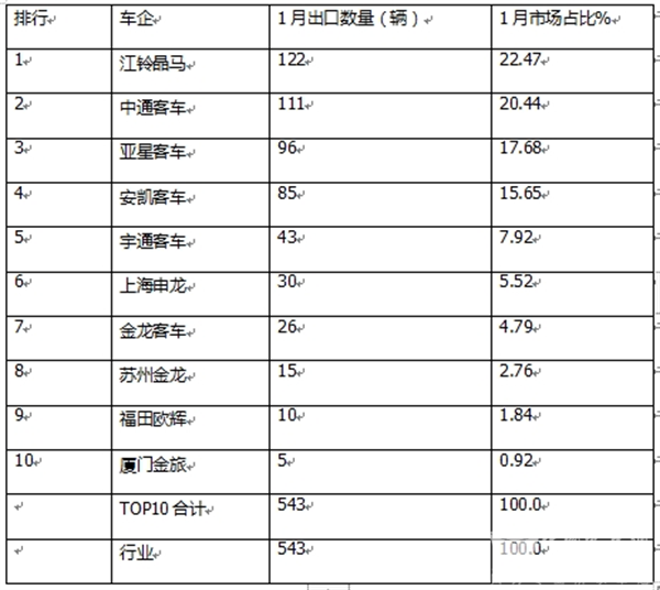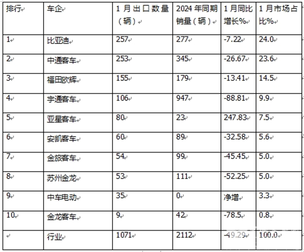 表5,根据中国客车统计信息网统计数据,202,5年1月我国公交客车累计出口1071辆,同比下降49.29%,排名前10的企业排行如下表: