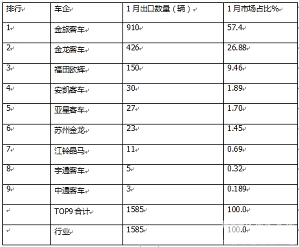 表2,根据中国客车统计信息网统计数据,202,5年1月我国大型座位客车有9家车企实现了出口销量,具体排行如下: