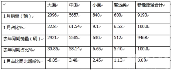 表1,根据终端上牌数据,2025年1月新能源大面、中面及小面、客运类等新能源轻客销量占比及占比同比如下