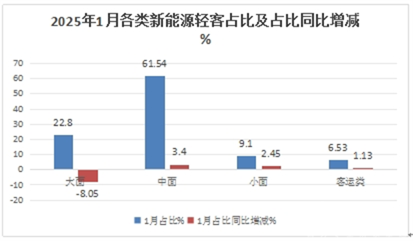 上图表可见,在2025年1月各类新能源轻客销量、占比及占比同比增减中: