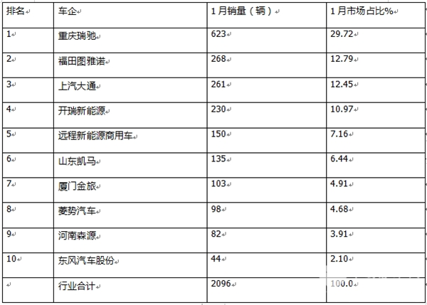四、1月新能源大面(载货容积在7-8方的轻客)排行:重庆瑞驰\图雅诺\上汽大通居前三