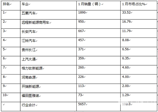 五、1月新能源中面(载货容积在6方的轻客)排行:五菱\远程\长安居前三