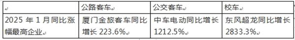 表3,2025年1月5米以上客车各细分市场同比涨幅及“黑马”企业: