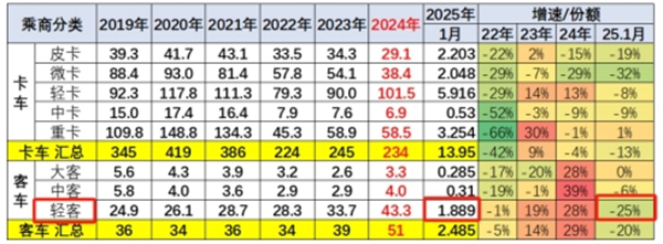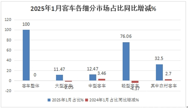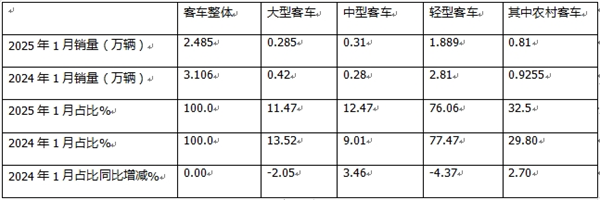 表1,2025年1月农村客车与轻客及客车大盘增速比较(数据来源:终端上牌信息)