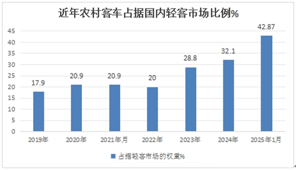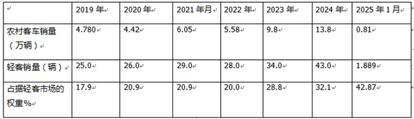 表2,根据终端上牌数据,2025年1月及近年国内农村客车市场销量及占据国内轻客市场的比例统计如下: