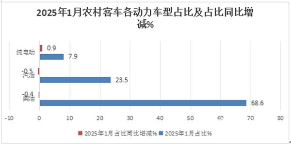 上牌数据显示,2025年1月,农村客运市场中销量占比最大的是柴油动力车型,其次为汽油。柴油占比近7成,但同比呈现减少趋势,纯电动占比最小,但占比同比提升比较明显。