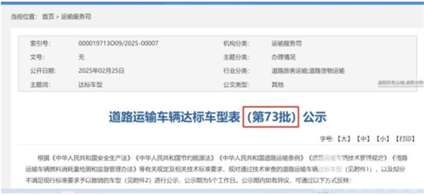 截图1,交通部道路运输车辆达标车型表(第73批公示)