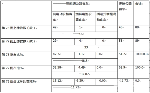 表1,第73批交通部达标车型公告上榜的各动力车型数量、占比与上一批环比(数据来源:交通部)