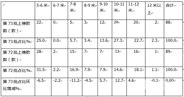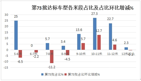 表2,根据交通部数据,第73批客车达标车型公告中上榜的各长度段车型数量、占比比及环比增减统计: