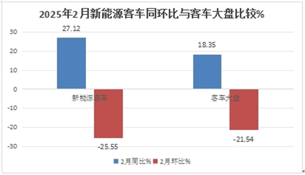 表3,2025年2月6米以上新能源客车同环比与客车大盘比较(数据来源:中国客车统计信息网):