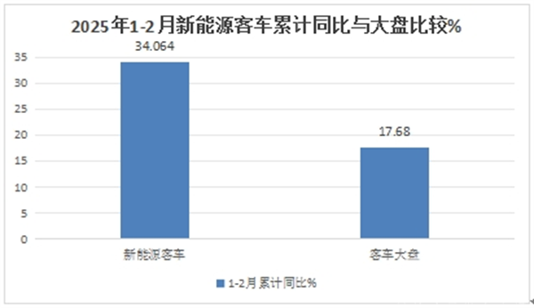 2025年1-2月6米以上新能源客车累计销售5436辆,累计同比增长34.06%。