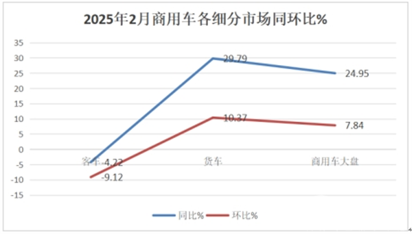 根据商用车专业委员会提供的数据,作为2025年的第二个月,我国商用车整体销量为31.33万辆(批发数据,下同),同比增长24.95%,,环比增长7.84%,可见今年2月我国商用车行业实现了同环比双增长。